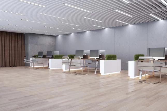 Other options include sheet vinyl for high-traffic areas, engineered wood for executive suites, and safety vinyl in office kitchens or restrooms.
